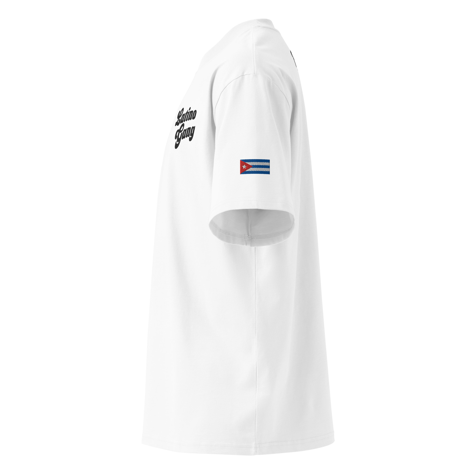 •	Embroidered “Latino Gang” script near heart
