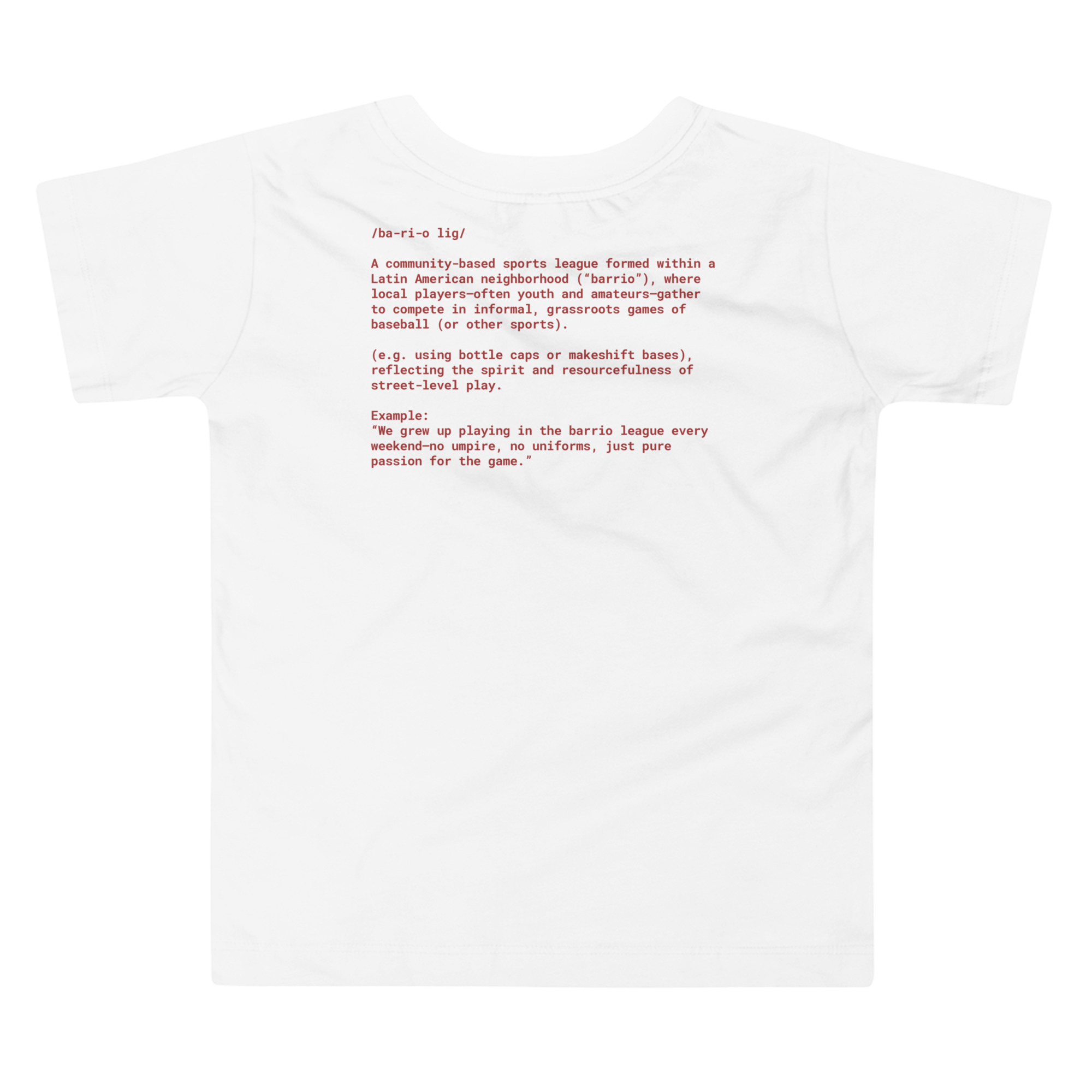 Gear up your littlest teammate with neighborhood pride—introducing the Barrio League Toddler T-Shirt, where block-style graphics meet pint-sized comfort.
